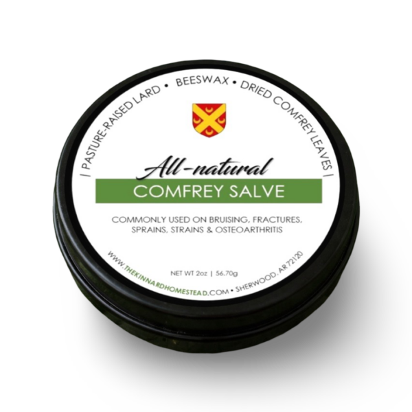 Our all-natural Comfrey Salve is made with pasture-raised lard, Beeswax, and Dried Comfrey Leaves grown and harvested on our farm.